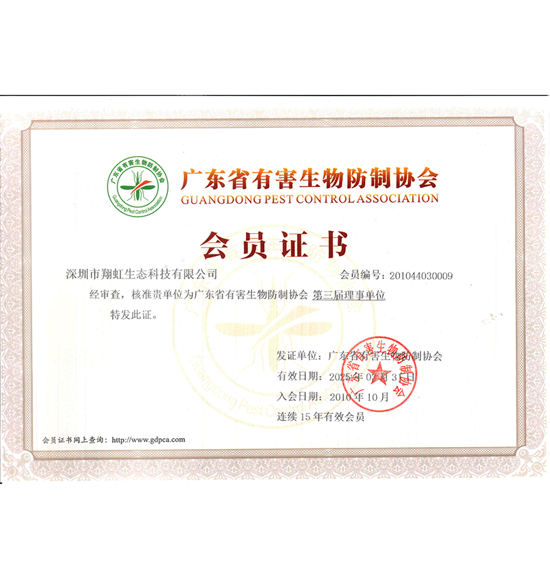 深圳市翔虹生態科技有限公司成立于1995年,是深圳最早成立的專業蟲害防治公司之一。公司發展至今獲得全國有害生物防制服務A級資質、廣東省有害生物防制服務A級資質、深圳市有害生物防制服務A級資質、廣東省有害生物防制服務A級資質、深圳市有害生物防制服務甲級資質的單位,是中國有害生物防治協會會員、廣東省有害生物防治協會會員、深圳市有害生物防治協會理事單位,多次獲得“深圳市十佳消殺單位”榮譽。
